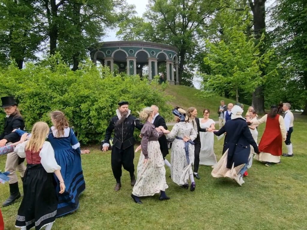 Dagens övergripande tema är femhundra år av dans, och på programmet står ett axplock av danser från senmedeltid fram till mitten av 1800-talet av dansare i kläder från fem århundraden. En av Sverige främsta experter på dräkthistoria kommer att berätta om dräkterna. Det blir också tillfälle för dig som vill att själv prova på historisk dans, i trygga händer – vi tar hand om dig!